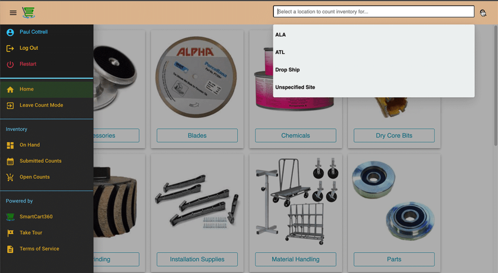 Choose an Inventory Location by clicking or tapping in the search bar at the top of the screen and select the location you want to count for.